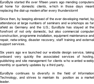 About EuroByte Computers We offer an initial consultation to discuss how you might benefit by entering into a relationship with EuroByte Computers absolutely free of charge.  All we ask for is a little of your time, so why not get in touch? Our Philosophy: We believe a computer, a network, a server or a website are tools of your business to help you work better. They should be aids, not hindrances, and we’ll help you to make sure they remain exactly that. How We Work: Personal contact, building a relationship upon which you can rely and trust, is key to our method of operation. We can be contacted 24/7 365, your computer doesn’t recognise a dark night, a weekend or a Bank Holiday ............ neither do we!
